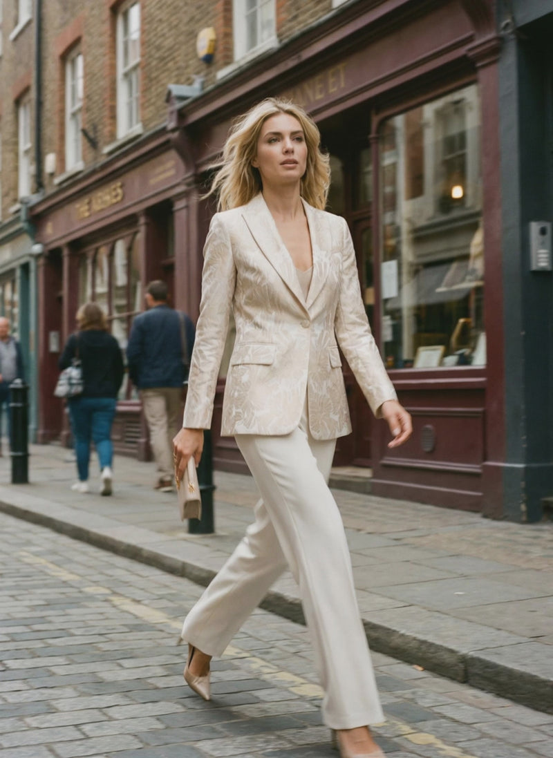 Crafted from textured jacquard fabric, the Nouveau Fit Jacket merges classic tailoring with a touch of artistic sophistication. The structured silhouette, defined by strong shoulders, a single-button closure, and refined flap pockets, exudes confidence and modern femininity. The subtle sheen and floral texture bring depth and allure, making it a perfect statement piece for after-hours elegance — where sophistication meets effortless glamour.